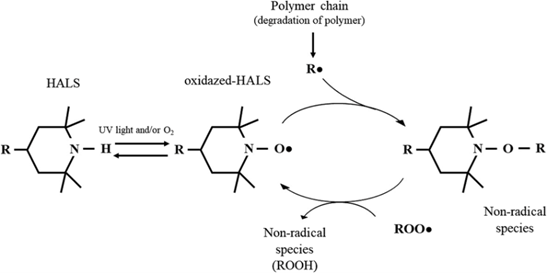 HALS (Hindered Amine Light Stabilizers) پرکاربردترین و مؤثرترین پایدارکنندههای UV هستند. آنها رادیکالهای آزاد را از بین میبرند و در عین حال طی چرخهی Denisov cycle دوباره به حالت اولیه بازمیگردند، بنابراین اثرشان ماندگار است. مطالعه Gijsman (2017) نشان داد که HALS در پلیاولفینها عملکردی بسیار بهتر از سایر stabilizerها دارد. ترکیب HALS با نانوذرات مانند(ZnO) طول عمر پلیپروپیلن را در فضای بیرونی چند برابر افزایش میدهد. (Gijsman, 2017; Brostow et al., 2020)