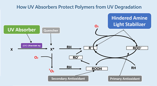 هنگامی که پلیمر یا افزودنیهای آن انرژی UV را جذب میکنند، مولکولها به حالتهای برانگیخته singlet) یا (triplet میروند. اگر این حالتها خاموش نشوند، میتوانند واکنشهای تخریبی آغاز کنند. با جذب این انرژی اضافی، آن را به گرما یا تابش غیرمضر آزاد میکنند.